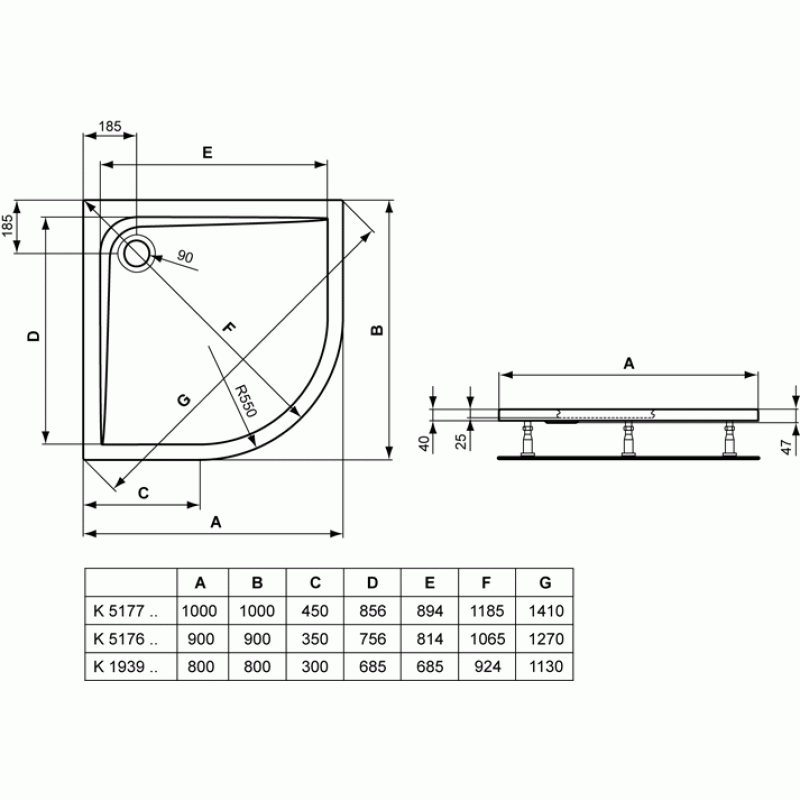 IDEAL Standard ULTRA Flat sprchová vanička akrylátová čtvrtkruh 90 x 90 x 4 cm K517601Průměr odpadu: 90 mm.