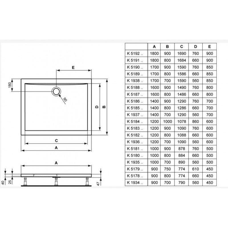 IDEAL Standard ULTRA Flat sprchová vanička akrylátová obdélníková 100 x 90 x 4 cm K518101Průměr odpadu: 90 mm.
