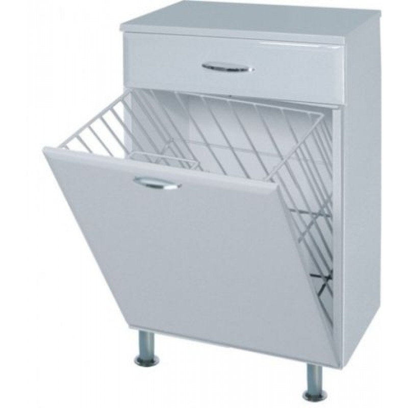 Nízká koupelnová skříňka na dvou nohách široká 50 cm s plnými dvířky, jednou zásuvkou a košem na prádlo je osazena celokovovými lesklými úchytkami K.