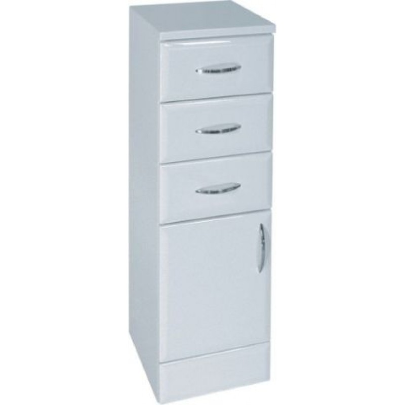 Koupelnový nábytek - nízká koupelnová skříňka s plnými dvířky, třemi zásuvkami, na soklu, levá.