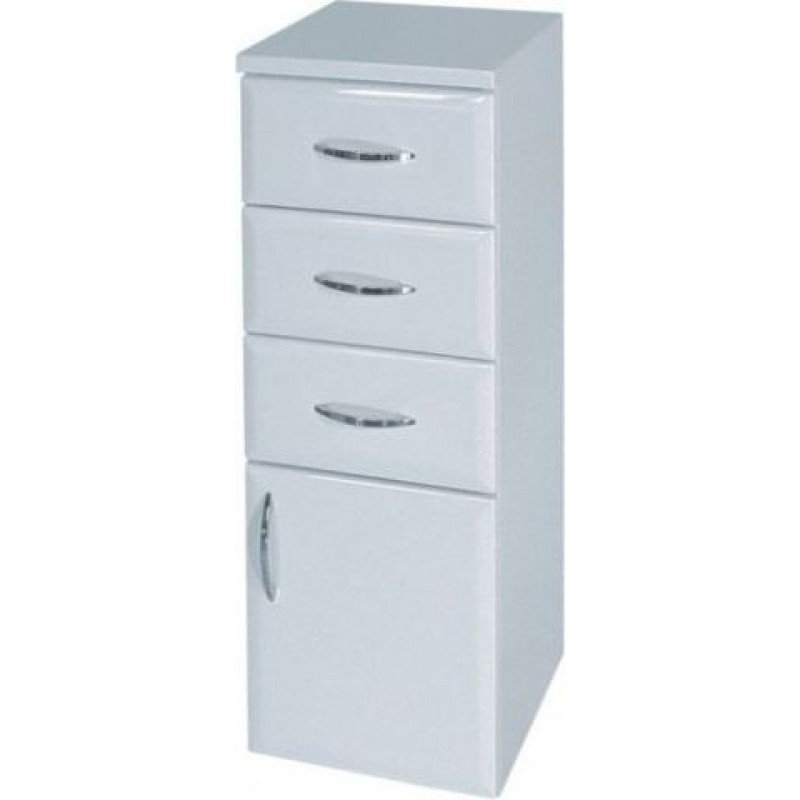 Koupelnový nábytek - nízká koupelnová skříňka závěsná s plnými dvířky, třemi zásuvkami, pravá.