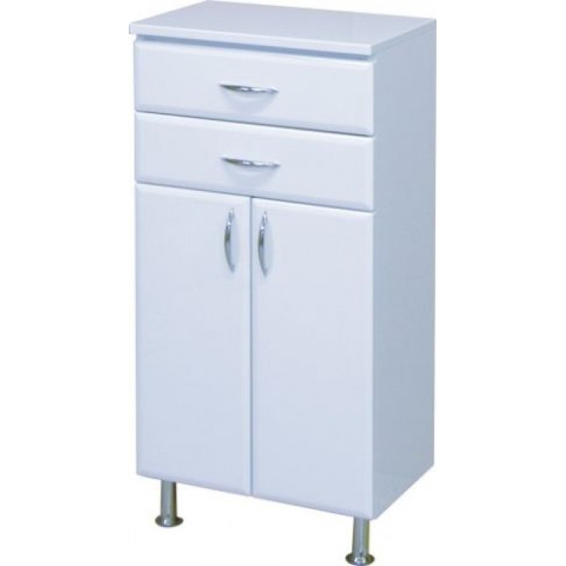 Koupelnový nábytek - střední koupelnová skříňka s plnými dvířky, na dvou nožičkách, se dvěma zásuvkami, za plnými dvířky jedna stavitelná police. Tuto skříňku můžete objednat v provedení Klasik/Variant nebo Azzurra, liší se pouze úchytkami. Věnujte tomu pozornost při volbě série.