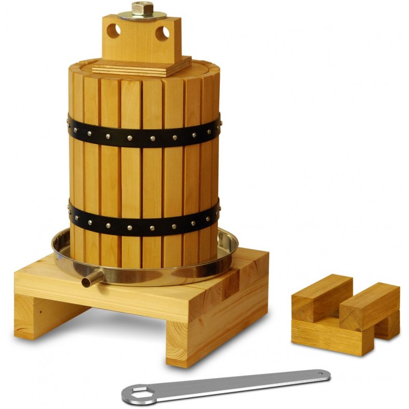 S objemem koše 15 litrů a výtěžností okolo 50% už zvládnete nadělat dostatek šťávy pro celou rodinu. Výhodou tohoto lisu je vedení přítlačné desky na šroubovici, což zamezuje borcení přítlačné desky při lisování. To se hlavně projevuje při lisování moučných jablek. Základna lisu je vyrobena z masivní desky tloušťky 40 mm, prostřední lamela v místě ukotvení šroubovice je z tvrdého jasanového dřeva. Lamely koše jsou rovněž z tvrdého jasanového dřeva. Šroubovice je z nerezu.• Rozměry: 33 x 33 x 60 cm