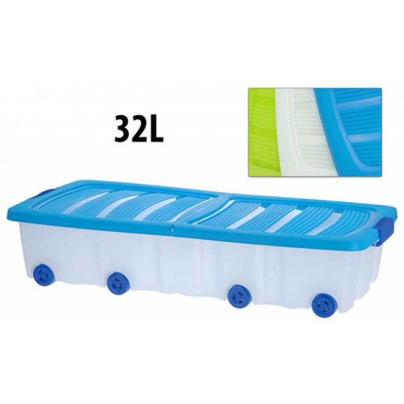 KAISERHOFF Úložný box pojízdný s klip víkem 32 l plastový 79x38x17 cm zelenýPlastový úložný box na kolečkách. Průhledný s barevným klip víkem (modrá, zelená,bílá). Otevíratelný ze dvou stran. 79x38x18 cm, 32 l.