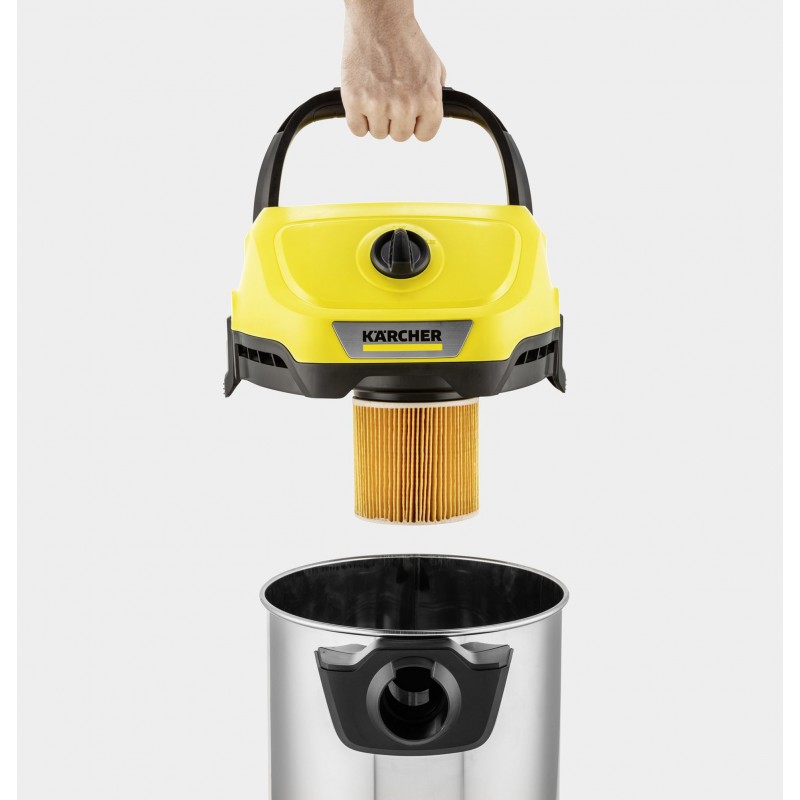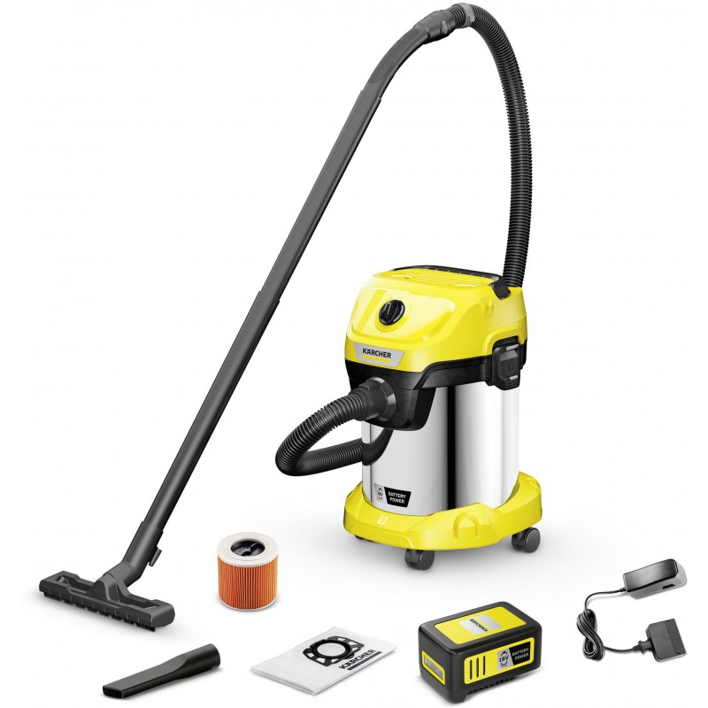 Žádný kabel. Bez omezení: bateriový vysavač na mokré a suché vysávání WD 3-18 S, který je součástí 18 V bateriové platformy Kärcher Battery Power nabízí maximální flexibilitu, kompaktní design a svobodu pohybu. Zařízení dokonale kombinuje sací hadici o délce 2 metry a klipsovou podlahovou hubici a dokáže během okamžiku odstranit mokré, jemné i hrubé nečistoty. Zařízení je dále vybaveno robustní a nárazuvzdornou nádobou z nerezové oceli o objemu 17 litrů, jednodílným kartušovým filtrem a také fleecovým filtračním sáčkem. Skladování sací hadice šetří místo; jednoduše jej zavěste na hlavu zařízení. Mezi další funkce patří praktická funkce fukaru pro oblasti, kde není možné vysávání, odkládací prostor na nářadí a drobnosti, otočný spínač pro snadné zapnutí a vypnutí přístroje, ergonomicky tvarované madlo pro přenášení a také "Pull & Push" uzamykací systém, který umožňuje snadné otevírání a zavírání nádoby. Parkovací poloha na nárazníku umožňuje rychlé a pohodlné uložení trubic a podlahové hubice při krátké přestávce při práci. Baterie a nabíječka jsou součást balení.