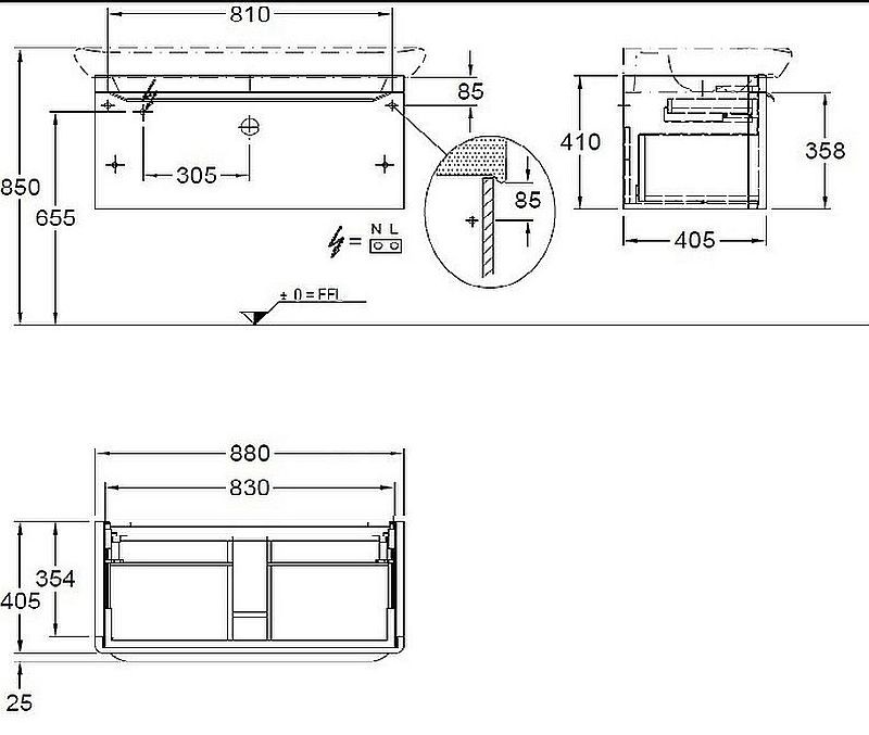 - 1 výsuvná zásuvka vč. LED osvětlení (max. 4 W, 3200 K, 300 lm, energetická