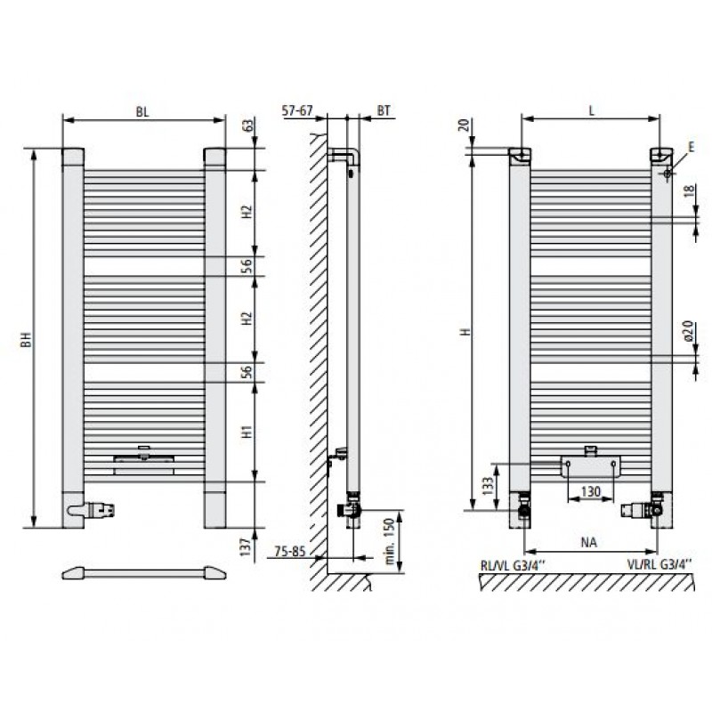 Včetně rohového ventilu, uzavíracího šroubení a termostatické hlavice. Montážní sada je přiložena, splňuje třídy požadavků 1 a 2 podle směrnice VDI 6036. Na místě montáže je nutné zkontrolovat dostatečnou nosnost stavebního materiálu stěny. Všechny viditelné části upevnění v barvě otopného tělesa.