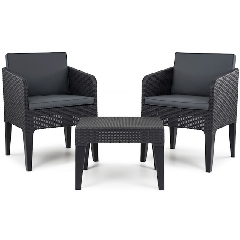 KETER COLUMBIA Set balkonový, ratan, grafit/šedá 17205968Columbia je balkónový set v atraktivním ratanovém stylu. Skládá se ze stolku a dvou křesel. Snadná montáž a bezúdržbové provedení. Vyrobeno z odolného materiálu s neblednoucími barvami. Sestava odolává povětrnostním podmínkám a výkyvům počasí. Dodáváno včetně sedáku. Čištění měkkým hadříkem vlažnou vodou se saponátem.