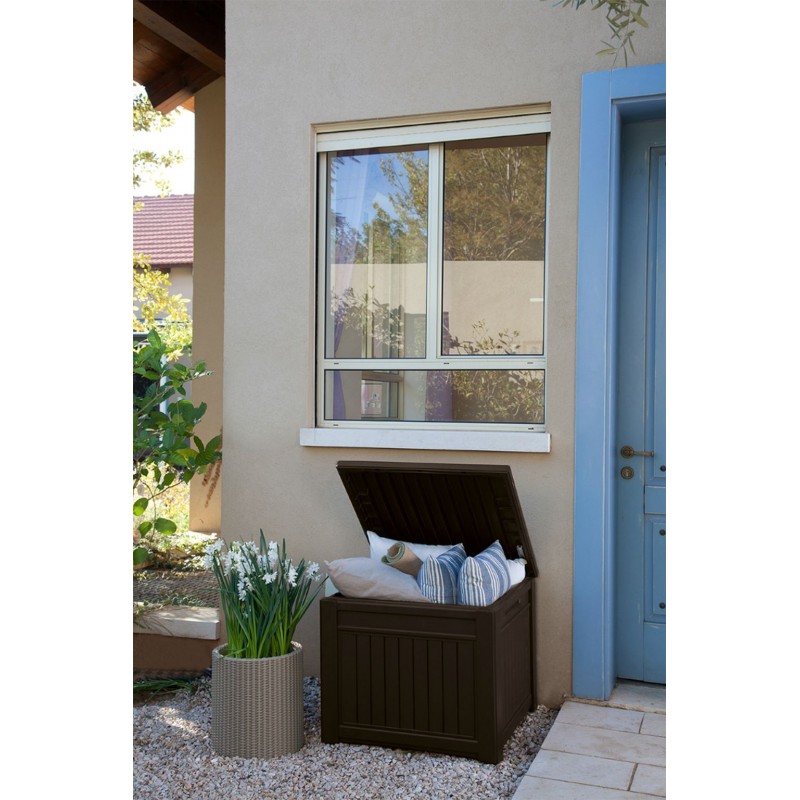 Úložný box Cube Wood s objemem 208 litrů je univerzálním řešením vašich prostor. Poslouží k uložení polštářů, zahradního náčiní, hraček, sportovních potřeb, ale zároveň i jako stolek nebo místo k usazení. Jednoduchý design napodobující strukturu dřeva podtrhne vzhled vaší terasy či zahrady. Box je vyroben z vysoce kvalitního plastu odolného vůči nepříznivému počasí i UV záření. Jeho montáž je velmi snadná a rychlá.