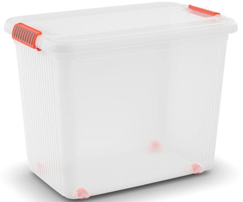 Úložný box KIS K Latch box v průhledno-oranžovém provedení s rozměry 59 x 45 x 39 centimetrů se stane vaším výborným pomocníkem při uskladňování věcí ze zahrady, dílny či garáže. Objem boxu totiž činí 69 litrů. Tento objem je dostatečný na uskladnění i větších a objemnějších věcí. Box je vyrobený z odolného plastu, který vydrží nárazy i nízké (-20°C) a vysoké teploty (100°C). V případě potřeby je možné více boxů stohovat na sebe a prázdné boxy zasouvat do sebe.Největší výhodou je jednoduchá manipulovatelnost s tímto boxem. Má ergonomické rukojeti pro snadný přenos a navíc je opatřen kolečky, které vám pomohou box přesunout, i když ho máte úplně plný. Výhodné je i průsvitné provedení, které vám usnadní hledání, i když máte více boxů na sobě. Box je velmi odolný proti nárazům a vysokým teplotám. Rozsah teplot, které box zvládne, je od - 20°C do 100°C. Pro ještě větší zajištění boxu i v případě pádu je box opatřen víkem s klipovým uzavíráním. Navíc se dá vybavit vnitřním zásobníkem.