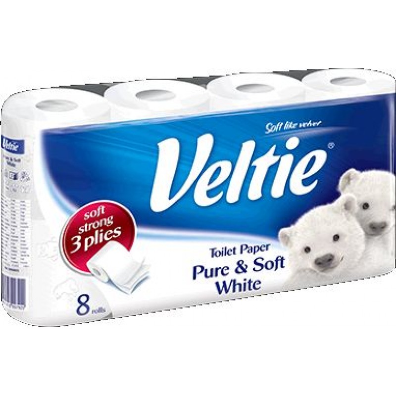KLEENEX Welcomes Veltie Toaletní papír 8 rolí, 3-vrstvý, bílý 149781Výjimečně pevný toaletní papír Veltie Pure & Soft White vyniká jemností a spolehlivostí tří vrstev. Roztomilé lední medvídky najdete i na útržcích toaletního papíru.