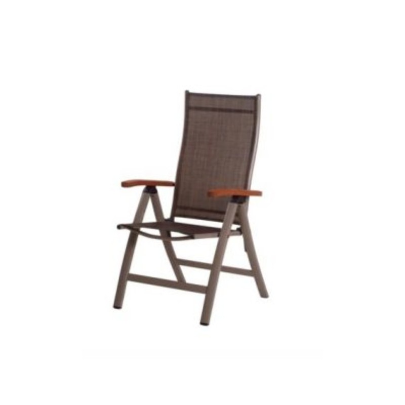 Křeslo polohovací ELBE champagne 67/1003Zahradní křeslo , které nabízí 5 poloh pro pohodlné posezení a relax na Vaší zahradě. Hliníková kostra barvy champagne s dřevěnýma područkama + textílie 4x4mm barvy cappuccino. Textilie je odolná vůči počasí.