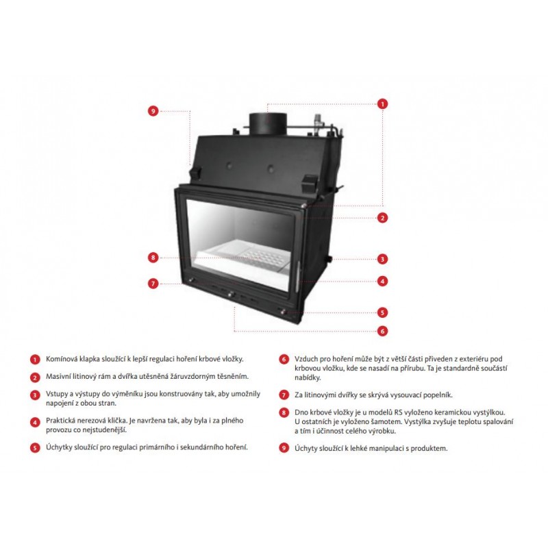 - Dno krbové vložky je u modelů RS vyloženo keramickou vystýlkou. U ostatních je vyloženo šamotem. Vystýlka zvyšuje teplotu spalování a tím i účinnost celého výrobku