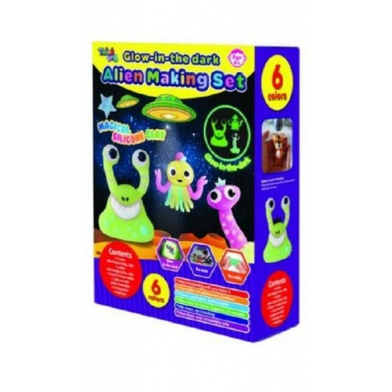 LOWLANDS Silikonová sada Mimozemšťan svítící ve tměBalení obsahuje 4 balení silikonové modelíny (20g) a 2 balení (10g), 2 pomůcky, 3 vykrajovátka, 4 hýbací oči, pečící papír a hrací plochu.