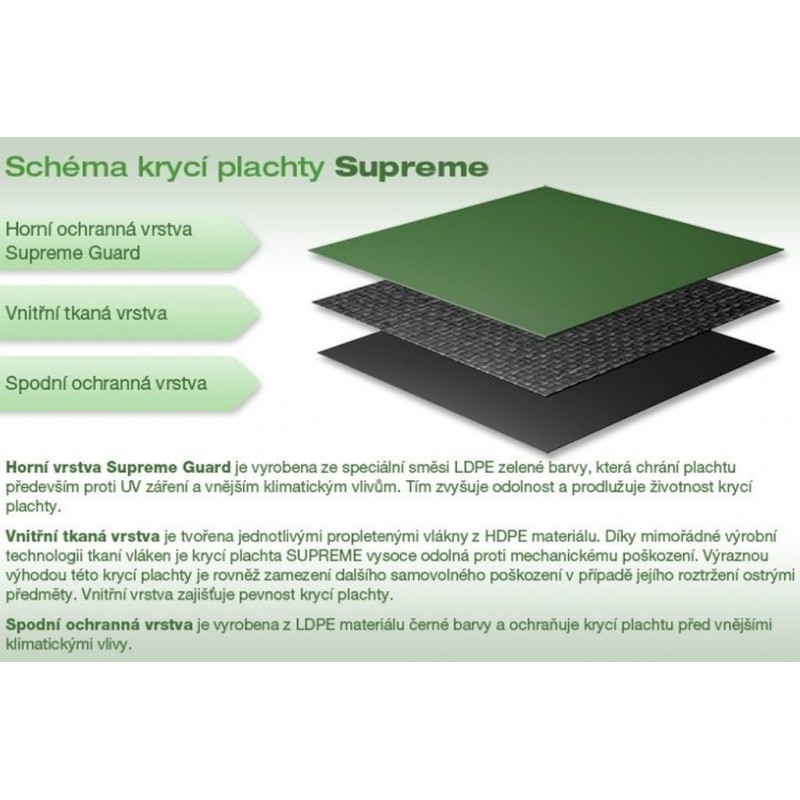Pro období, kdy není bazén používán, doporučujeme zakrytí krycí plachtou. Zamezíte tím vnikání mechanických nečistot např. listí, hmyzu nebo pylu do vašeho bazénu. Díky použití ochranné vrstvy Supreme Guard je krycí plachta Supreme pevnější a lépe odolává povětrnostním vlivům – nejedná se ale o zimní plachtu a používání při teplotách pod bodem mrazu životnost krycí plachty snižuje. Barva krycí plachty je zelenočerná nebo modročerná (barvu při objednávce nelze zvolit). K bazénu ji snadno a rychle uchytíte pomocí lanka a napínáku s ráčnou. Ocelové lanko potažené plastovou ochrannou vrstvou i napínák s ráčnou jsou součástí balení.Parametry: