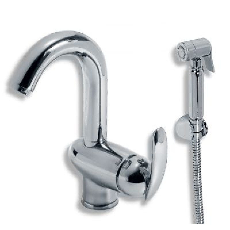 Umyvadlová a bidetová baterie s dvojzámkovou kovovou hadicí, pevným držákem sprchy a sprchovou růžicí se stop-ventilem.