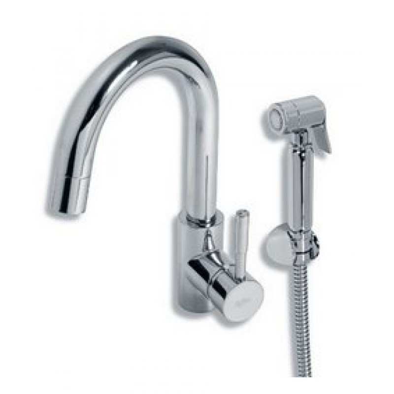 Umyvadlová a bidetová baterie s dvojzámkovou kovovou hadicí, pevným držákem sprchy a sprchovou růžicí se stop-ventilem.