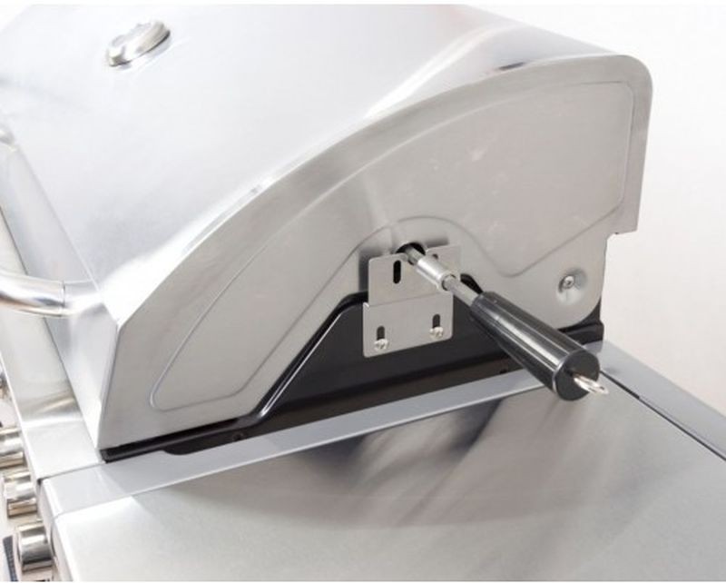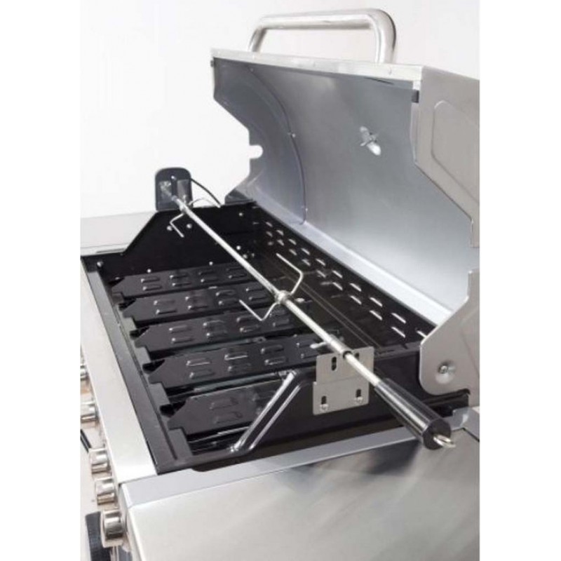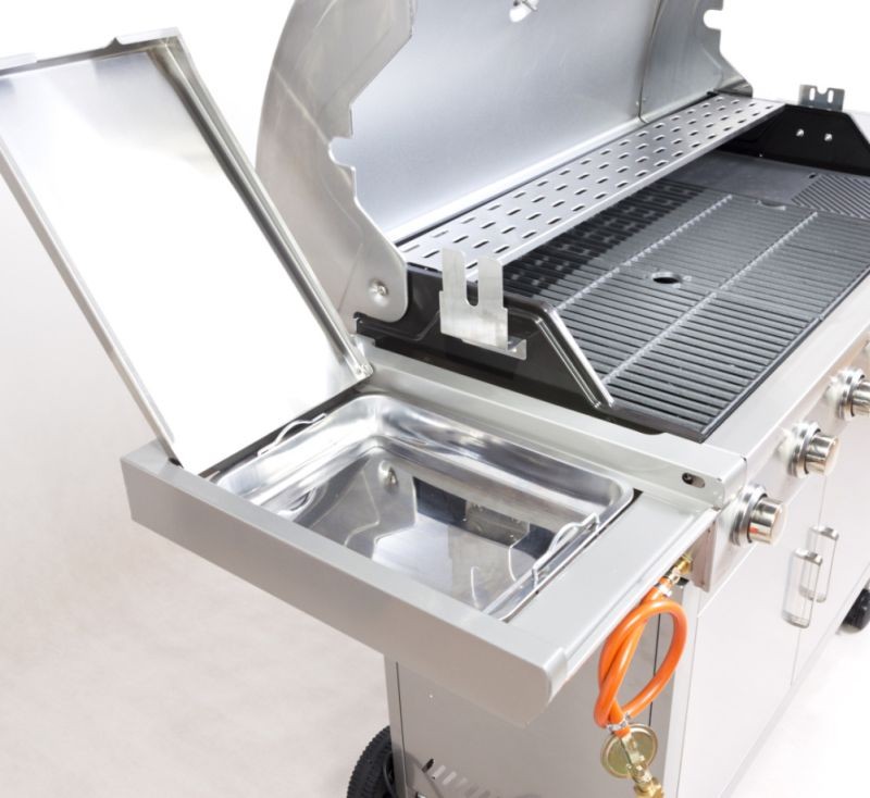 Zahradní plynový gril je opatřen odklápěcím krytem grilovací plochy a odkládacími poličkami na obou stranách. Pod levou odkládací plochou se skrývá nádobka, kam můžete odkládat např. naložené maso připravené ke grilování. Pod pravou odkládací plochou se nachází boční hořák. Dvířka grilu jsou vyrobeny z nerezové oceli.