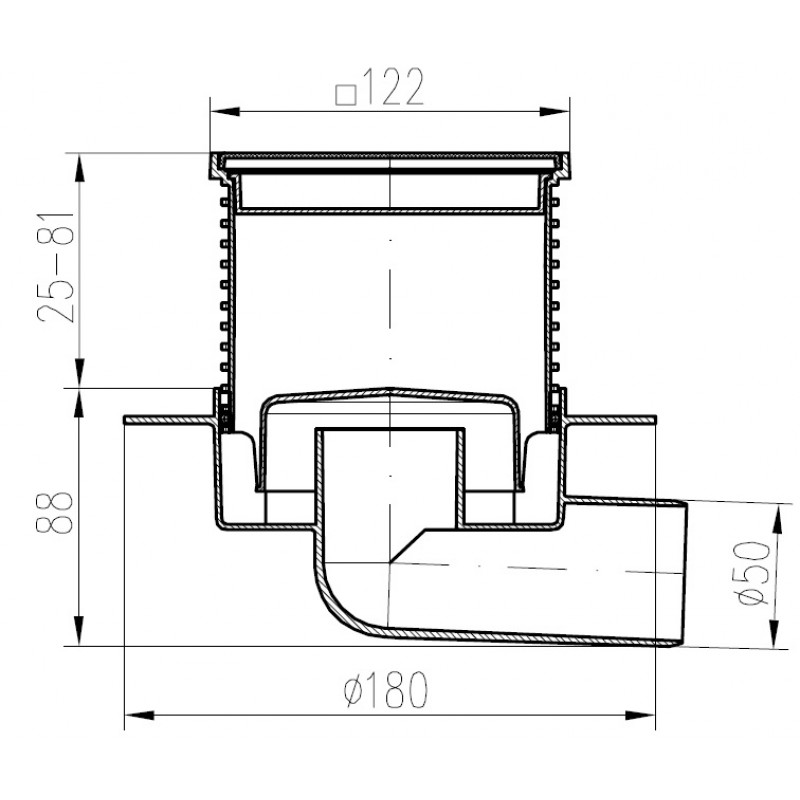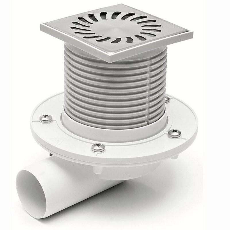 Podlahová vpusť boční DN 50 (PVB50N-PR2) nerez 122 x 122 mm, s přírubou 425