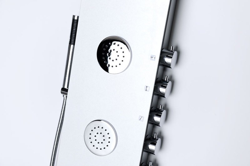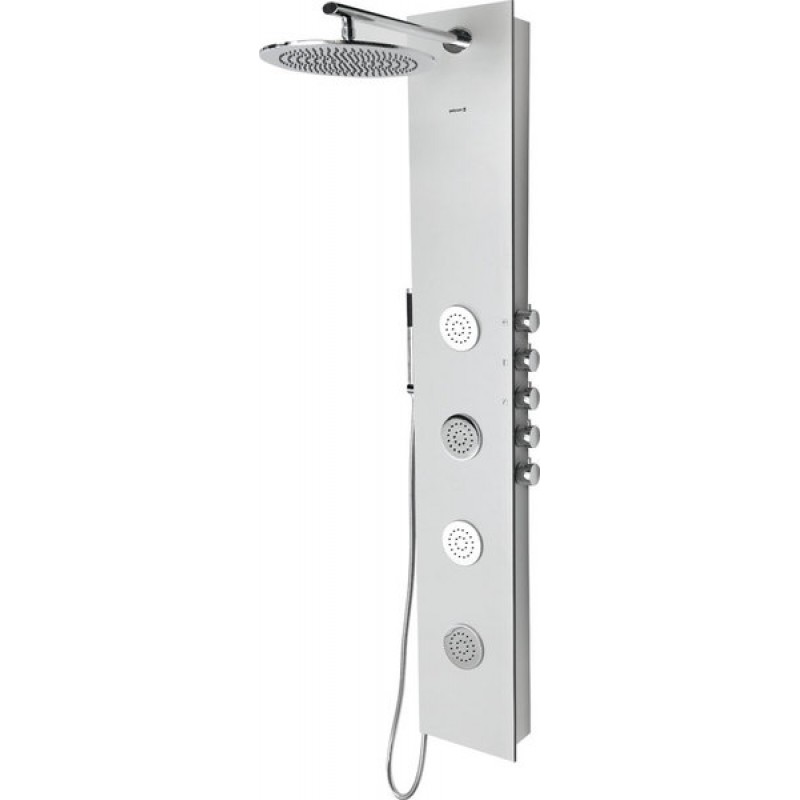 POLYSAN 5SIDE ROUND sprchový panel 250x1550mm, aluminiumSprchový kout v moderní koupelně dotváří elegantní sprchový panel, který oproti klasické baterii nabízí výběr proudu vody nejenom z ruční sprchy, ale i z hlavové sprchy, popřípadě i z masážních trysek. Sprchové panely lze zvolit v moderním stříbrném, efektním dřevěném nebo čistém bílém dekoru a tím lze získat perfektní soulad s obkladem interiéru. Panel 5SIDE je vyroben z kompozitního materiálu nebo akrylátu (bílá barva) a je určen pro montáž na stěnu. Ovládací prvky panelu jsou netradičně umístěny na boku, čímž je možno využít celé přední plochy panelu pro větší masážní trysky.