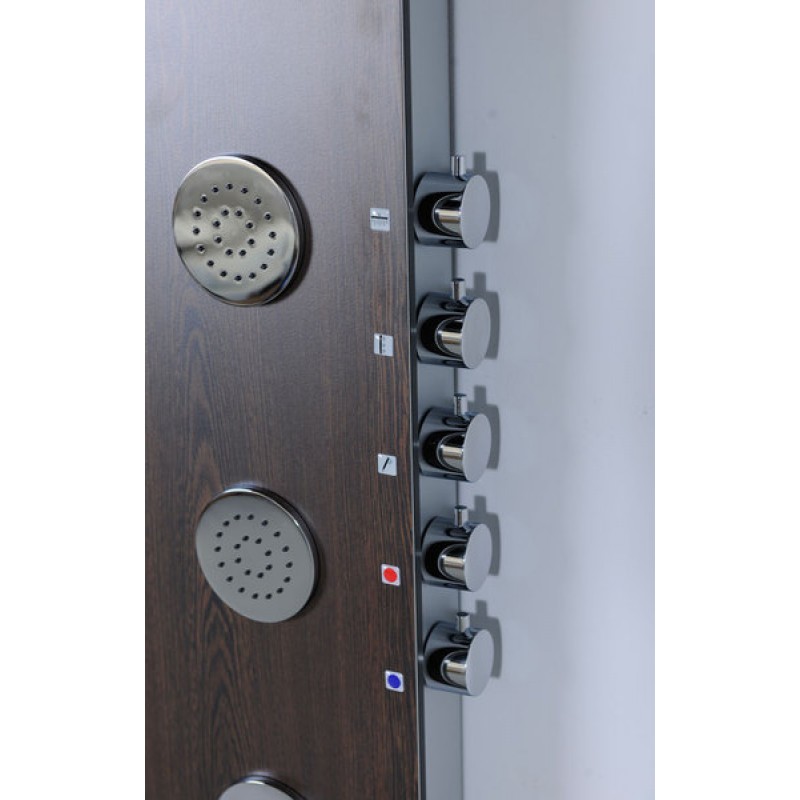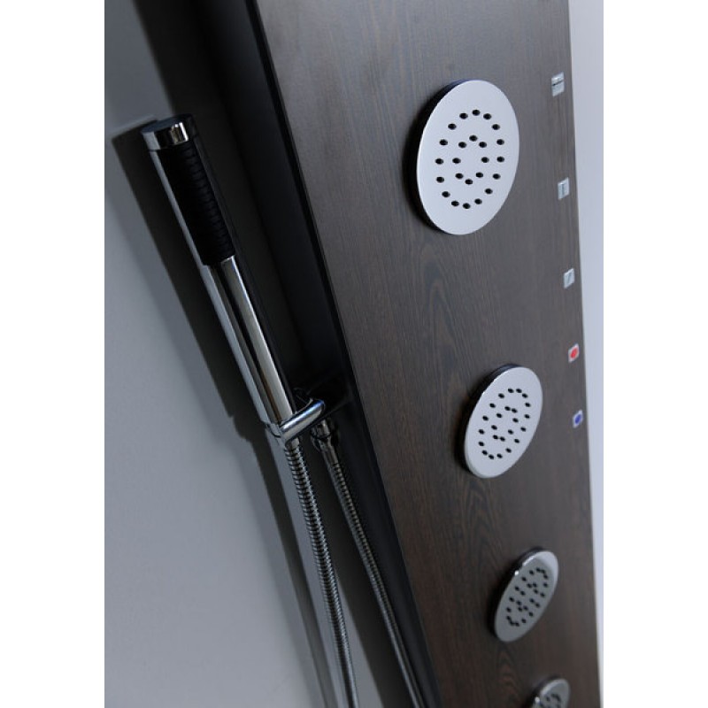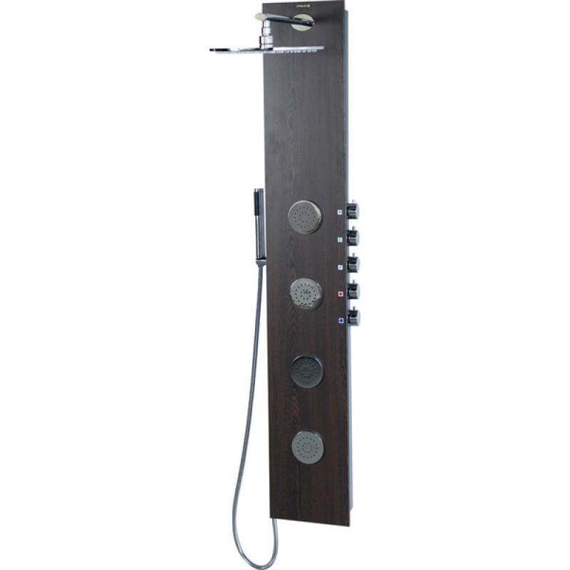 POLYSAN 5SIDE ROUND sprchový panel 250x1550mm, wengeSprchový kout v moderní koupelně dotváří elegantní sprchový panel, který oproti klasické baterii nabízí výběr proudu vody nejenom z ruční sprchy, ale i z hlavové sprchy, popřípadě i z masážních trysek. Sprchové panely lze zvolit v moderním stříbrném, efektním dřevěném nebo čistém bílém dekoru a tím lze získat perfektní soulad s obkladem interiéru. Panel 5SIDE je vyroben z kompozitního materiálu nebo akrylátu (bílá barva) a je určen pro montáž na stěnu. Ovládací prvky panelu jsou netradičně umístěny na boku, čímž je možno využít celé přední plochy panelu pro větší masážní trysky.