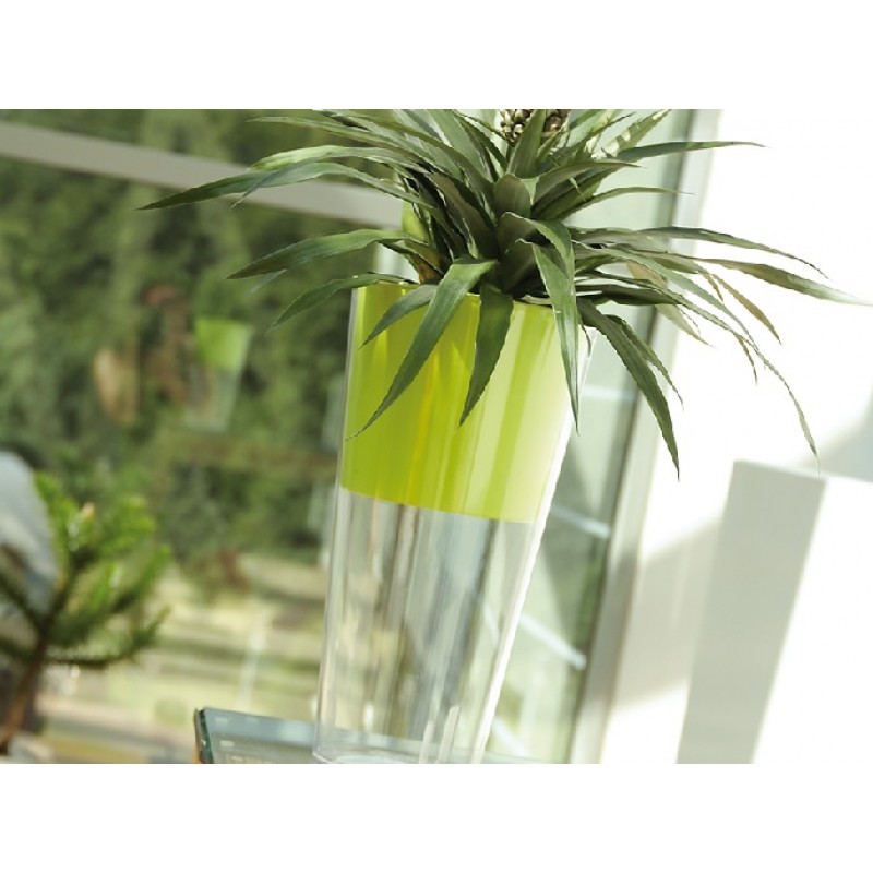 Uvnitř průhledného květináče se nachází barevná vložka na výsadbu rostlin.