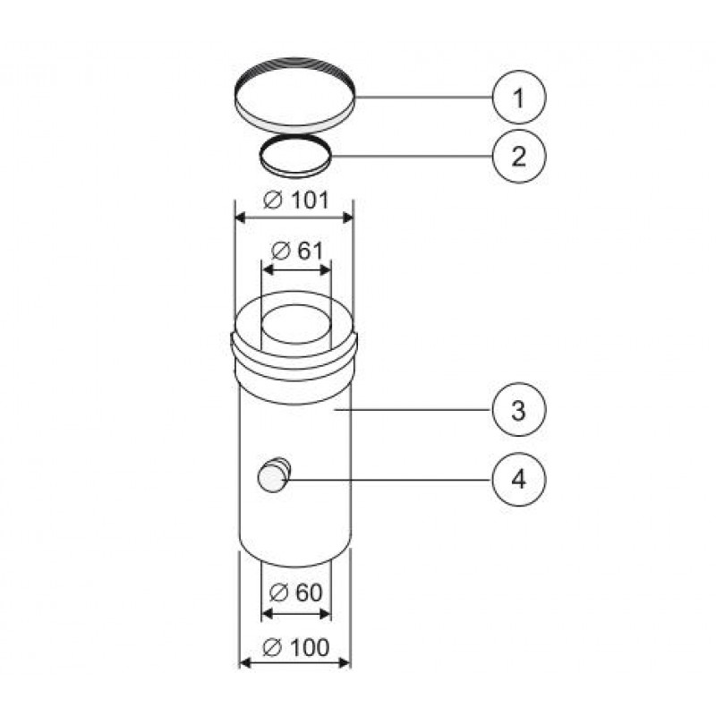 Jímka kondenzátu s výpustí se závitem G1/2”, určená pro odvod kondenzátu ze svislé nebo vodorovné trasy souosého potrubí sání a výfuku průměr 60/100mm.