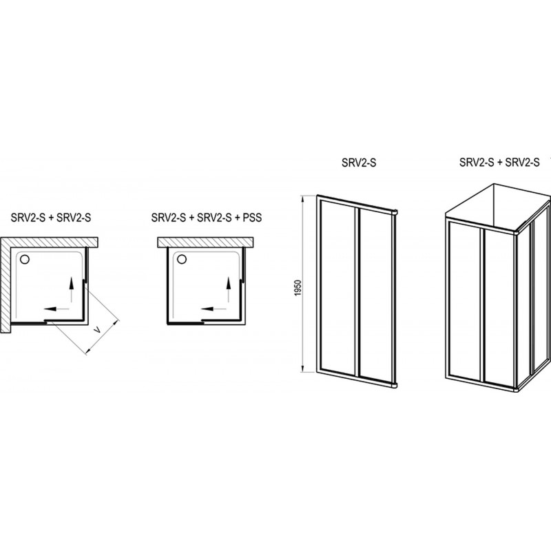 • K vytvoření rohového sprchového koutu je třeba objednat 2 kusy posuvných dveří typu SRV2-S. Kombinací různých rozměrů obou dílů získáte čtvercovou nebo obdélníkovou variantu sprchového koutu. (např. 750 x 900 mm, 900 x 900 mm, 800 x 1000 mm, atd.)