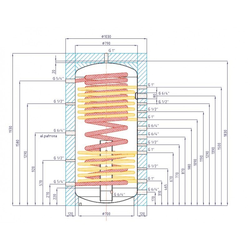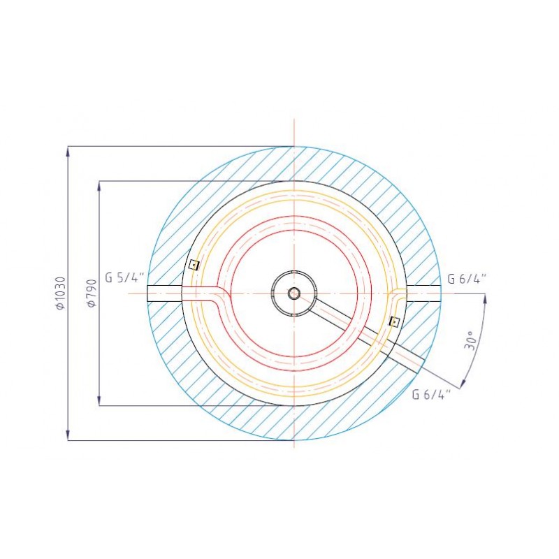 čidel a čtyři boční návarky se závitem G 1“ pro připojení dvou topných hadů.