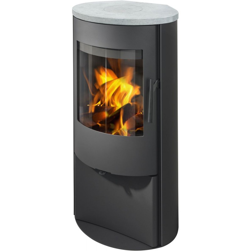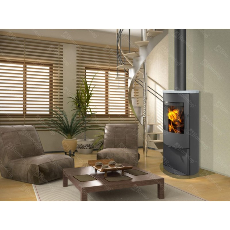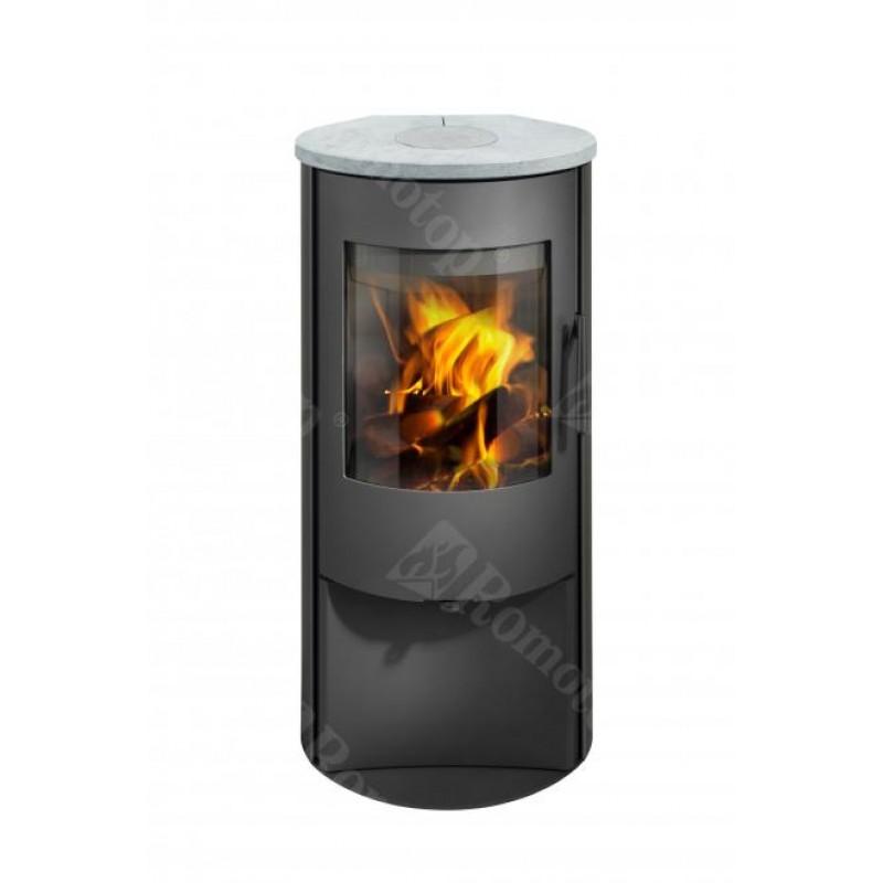Romotop Alpera E05 krbová kamna, plech, kámen"Prostorově nenáročná kompaktní kamna s oblíbenou oválnou základnou".