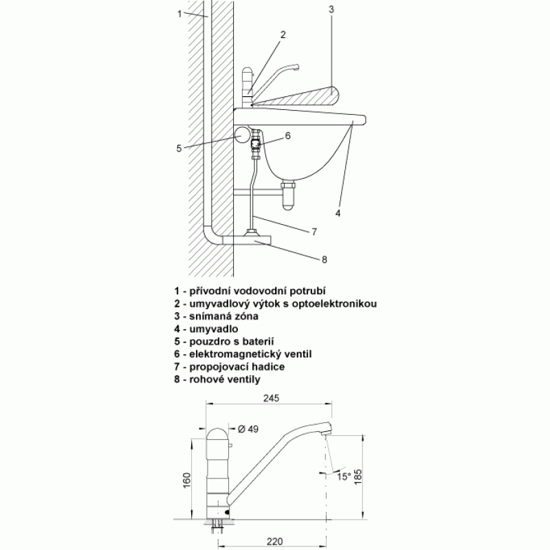 - reaguje na přítomnost rukou ve snímané zóně do vzdálenosti 0,3 m od snímače okamžitým spuštěním vody