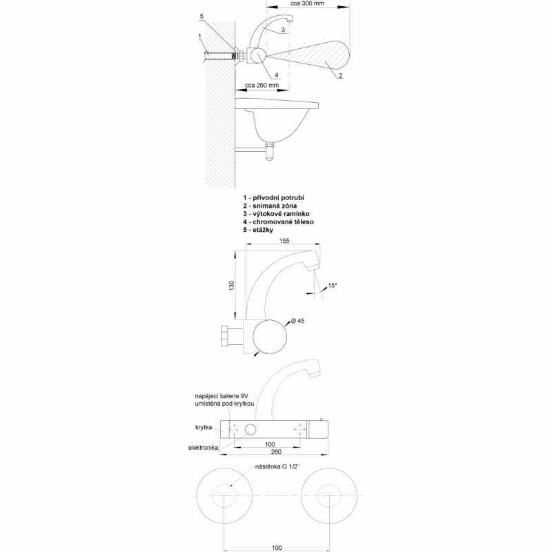- senzorová baterie reaguje na přítomnost rukou pod výtokovým ramínkem, spuštění vody nastane okamžitě, k vypnutí vody dojde po vyjmutí rukou ze snímané zóny po uplynutí nastavené doby ( možno nastavit v rozsahu 0,25 až 7,75 s )