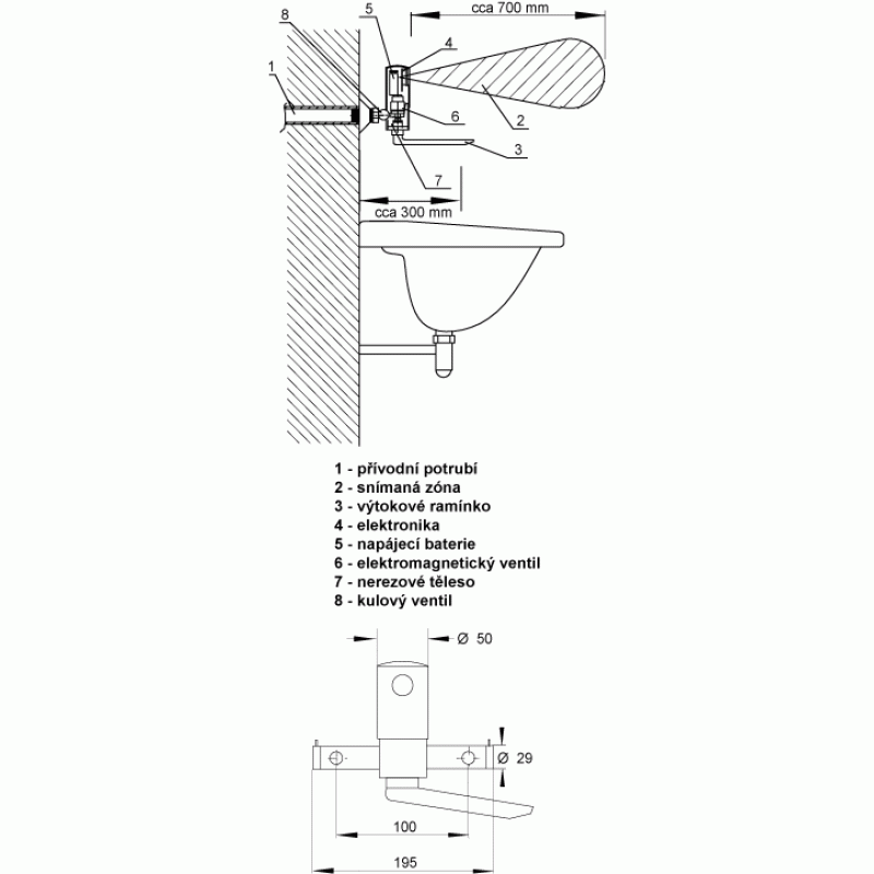 - reaguje na přítomnost osoby před senzorem, k spuštění vody nastane po cca 2 s