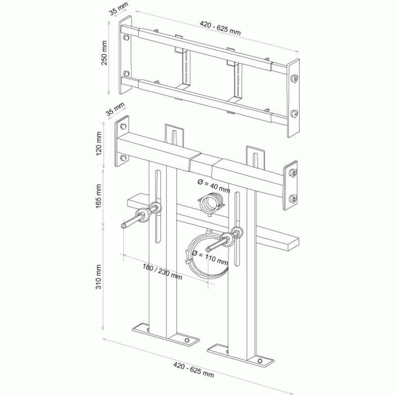 - rozteč šroubů pro uchycení pisoáru je možné libovolně nastavit podle typu použitého pisoáru, držák odpadu je posuvný ve vertikálním i horizontálním směru