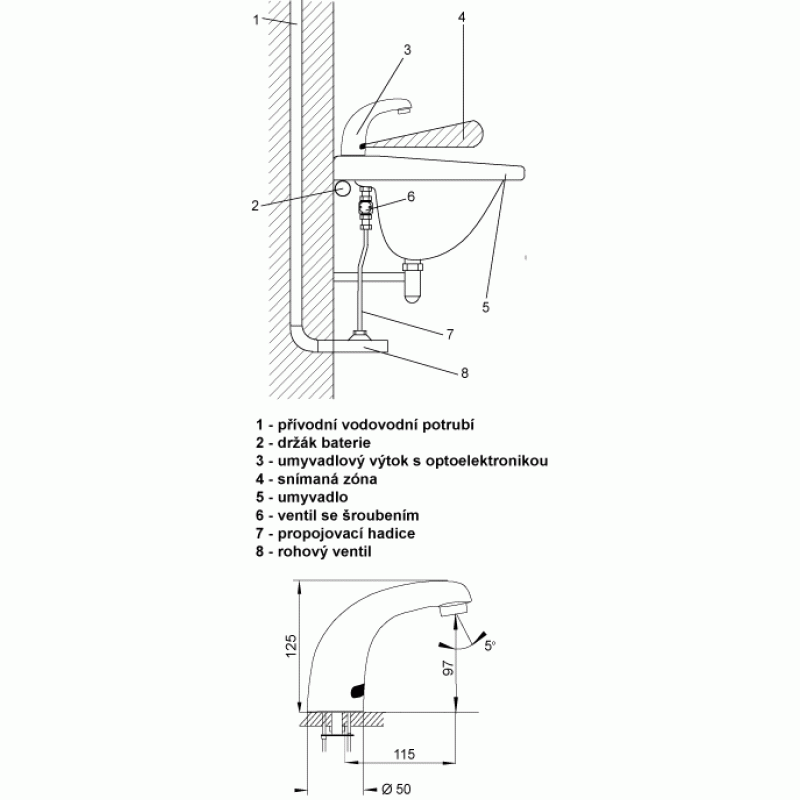 - reaguje na přítomnost rukou ve snímané zóně do vzdálenosti 0,3 m od snímače okamžitým spuštěním vody