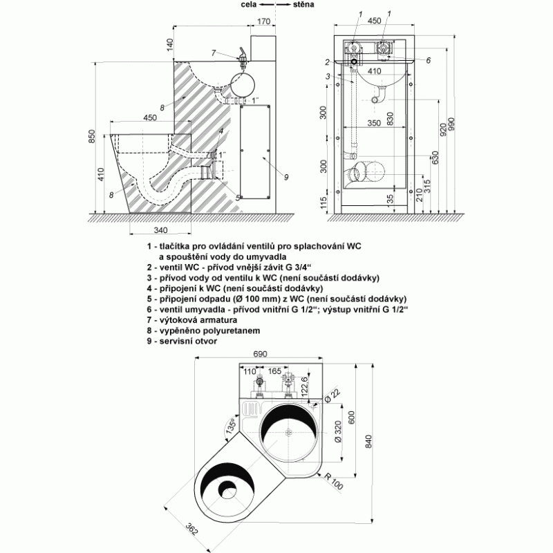 - kompaktní set WC s lisovaným umyvadlem, umyvadlovou armaturou a otvorem pro toaletní papír