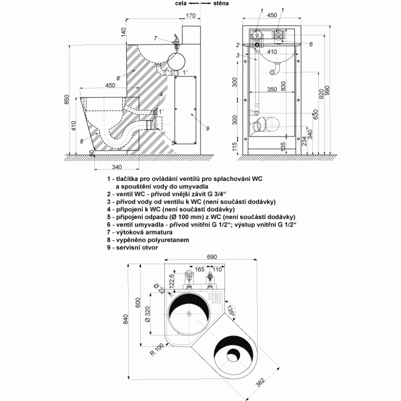 - kompaktní set WC s lisovaným umyvadlem, umyvadlovou armaturou a otvorem pro toaletní papír