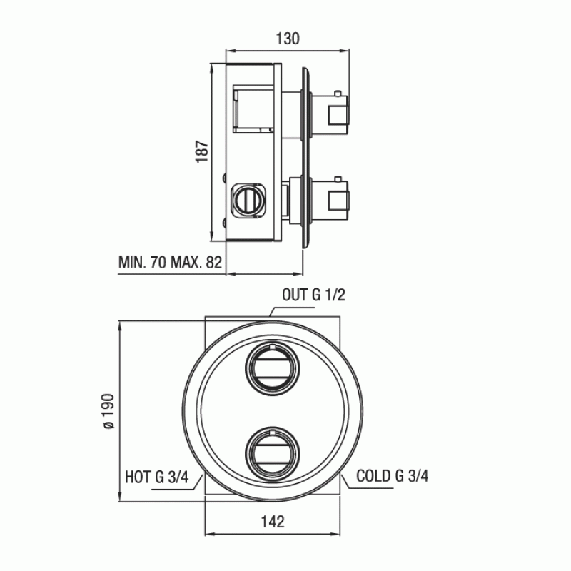 Podomítková termostatická sprchová baterie pro 2 výstupy.