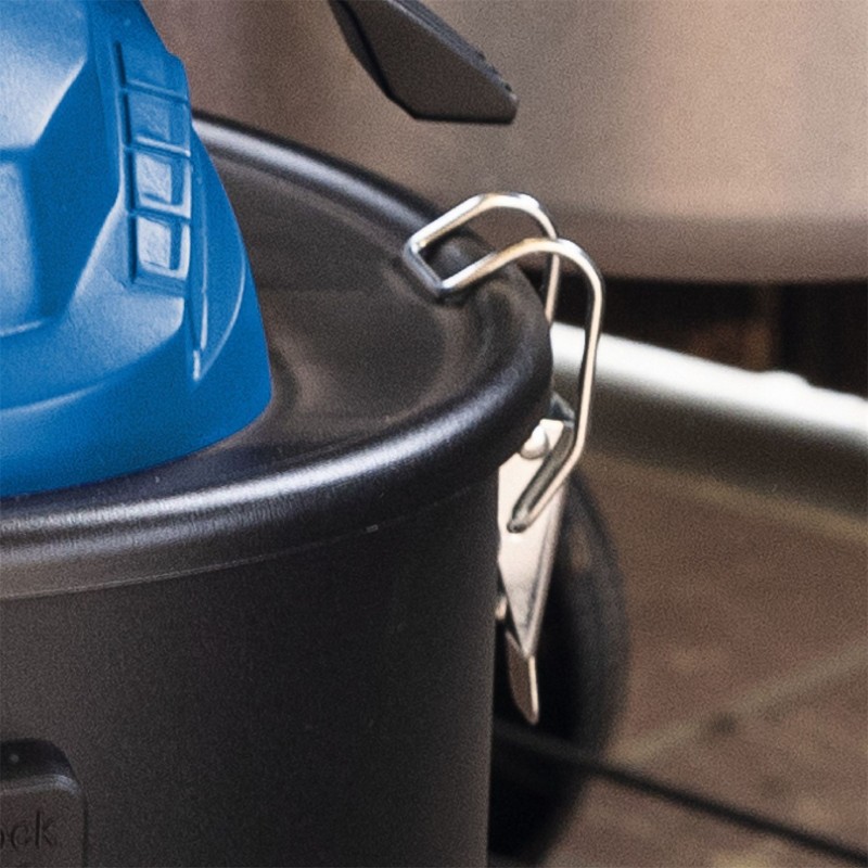 Odolná sběrná nádoba o objemu 20 litrů umožňuje delší práci bez častého vyprazdňování. To je navíc velmi snadné díky rychloupínacím uzávěrům. Velký pracovní rádius zajišťuje nehořlavá odsávací hadice o délce 150 cm, která je vhodná i pro práci s popelem. Praktický držák příslušenství pomáhá udržet pořádek a mít vše vždy po ruce