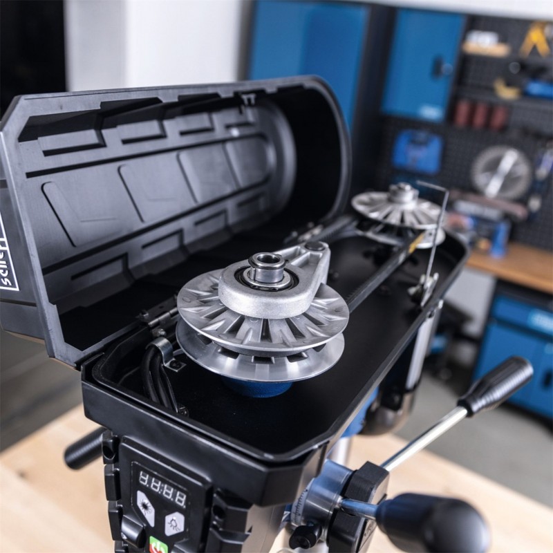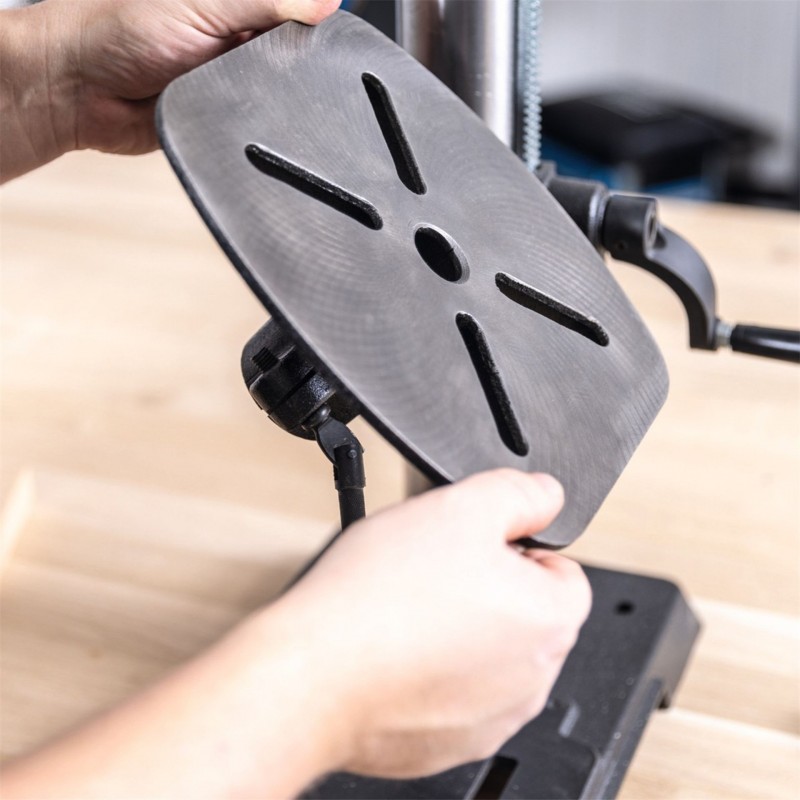 Silný 750W indukční motor poskytuje dostatek výkonu i pro náročnější úkoly a zajišťuje plynulý chod bez vibrací. Masivní litinová konstrukce se sloupem o průměru 65 mm zajišťuje vysokou stabilitu, zatímco velký pracovní stůl 240 × 240 mm nabízí dostatek prostoru i pro větší obrobky. Stůl lze otáčet o 360°, plynule výškově nastavovat a naklápět až o ±45°, což výrazně zvyšuje variabilitu práce.