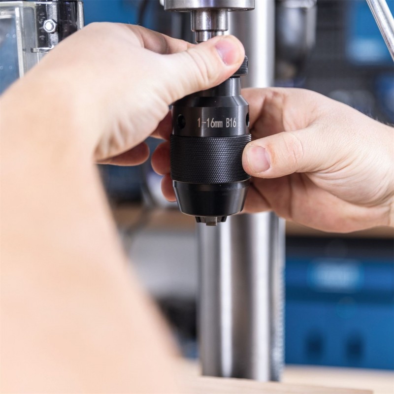 Kvalitní rychloupínací sklíčidlo s kuličkovými ložisky a ochranným krytem pojme vrtáky od 1 do 16 mm. Nastavitelný doraz hloubky zaručuje jednotné výsledky i při sériovém vrtání. Díky velkému výkyvu 152 mm lze opracovávat obrobky o průměru až 304 mm. Pevná základna umožňuje bezpečné uchycení vrtačky k pracovnímu stolu a ergonomická pogumovaná rukojeť zajišťuje pohodlné ovládání i při delší práci.