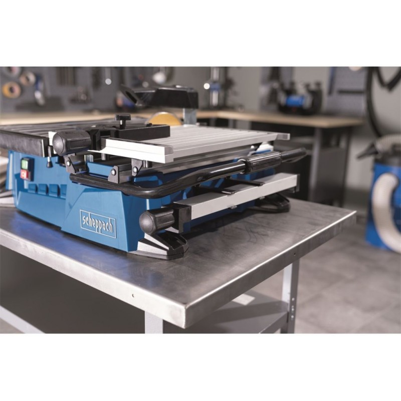 Moderní řezačka na dlažbu Scheppach WTS 2000 je výborným pomocníkem všech řemeslníků nebo kutilů pracujících často s obklady či dlažbou a je pro ně důležitá mobilita nebo potřeba kompaktního a lehkého stroje. Zásadní výhodou je koncepce s posuvným stolkem, díky čemuž nejsou problémy řezy o délce až 450 mm a výšce 32 mm. Stolek s přesnou milimetrovou stupnicí obsahuje i úhlové pravítko s integrovanou stupnicí pro řezání pod úhly a rovněž praktický posuvný boční doraz. Prémiový diamantový kotouč je, na rozdíl od běžných konstrukcí, pevně usazen, takže dlouhé řezy jsou velice přesné. Podle tloušťky materiálu jde výškově nastavit rovněž kryt kotouče. Silný motor 900 W s tepelnou ochranou si hravě poradí s řezáním dlažby, obkladaček, mramoru apod. Robustní podstavec obsahuje jímku na vodu pro chlazení kotouče a bezprašnou práci, integrovanou rukojeť s gumovým madlem, držáky na boční doraz a úhlové pravítko pro ochranu při transportu, gumové nožičky a otvory pro přidělání k pracovní desce. Stroj je vybaven nejmodernější bezpečnostní ochranou a je certifikovaný německou společností TÜV i pro dlouhodobé používání.