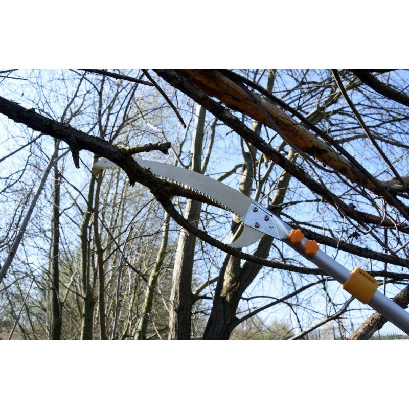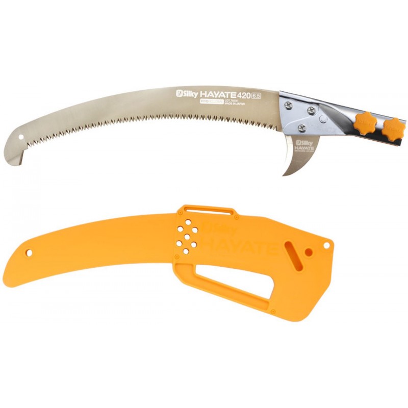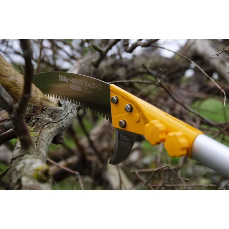 Hayate je opravdu robustní teleskopická pila určená pro profesionální arboristy. Její extrémní délka umožňuje řezat větve ve výškách až 6,5 metru bez použití žebříku. Řezná rychlost je srovnatelná s malou motorovou pilou. Díky konstrukci čepele, která řeže především v tahu, můžete pracovat efektivně a bez nadměrné únavy. Využijte lehkou, ale pevnou konstrukci hliníkového těla a nechte pilu pracovat za vás!