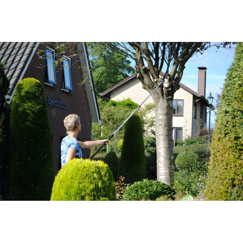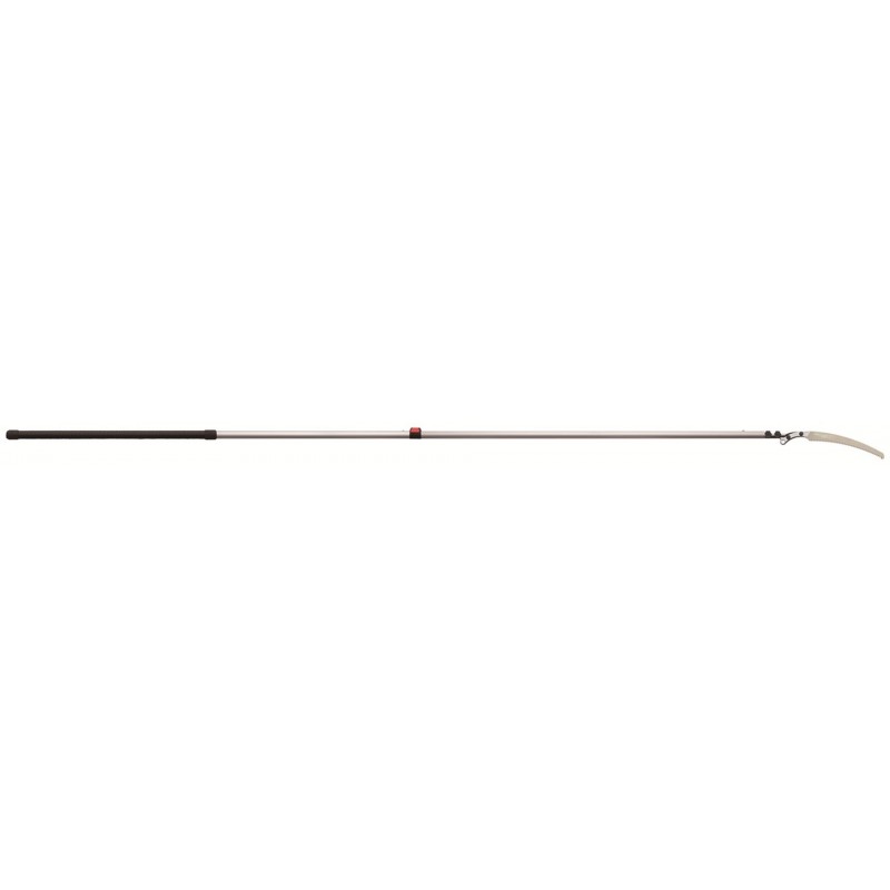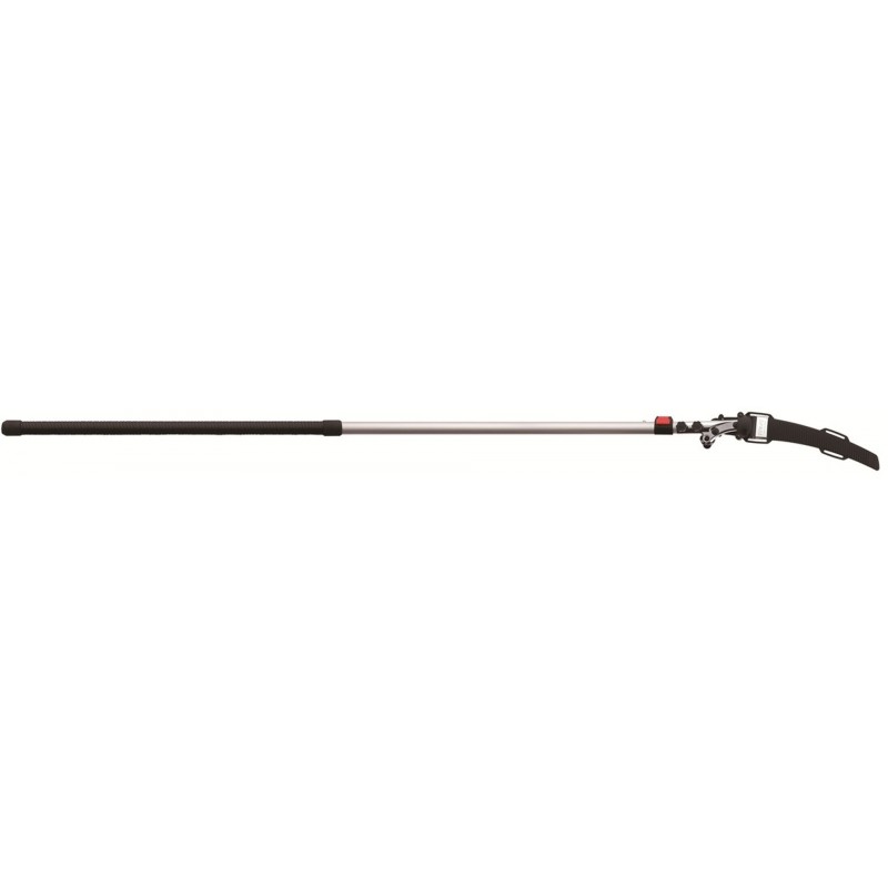 Hliníková násada má oválný tvar, díky kterému máte velmi přesnou kontrolu nad směrem řezu, což budete potřebovat při prořezávání ve velké výšce. Navíc tento tvar poskytuje větší pevnost a tuhost po celé délce tyčové pily a minimalizuje ohýbání. Při plném rozložení násady pak pila dosahuje maximální délky 3,9 metru. V kompletně složeném stavu má pila naopak pouhých 2,35 m, což oceníte při jejím transportu. Dva zajišťovací mechanismy (tlačítka a páky) společně vytvářejí nejbezpečnější a nejstabilnější zajištění preferované délky násady, přičemž nejnižší část je opatřena gumovou rukojetí pro pohodlné a bezpečné uchopení i za mokra.