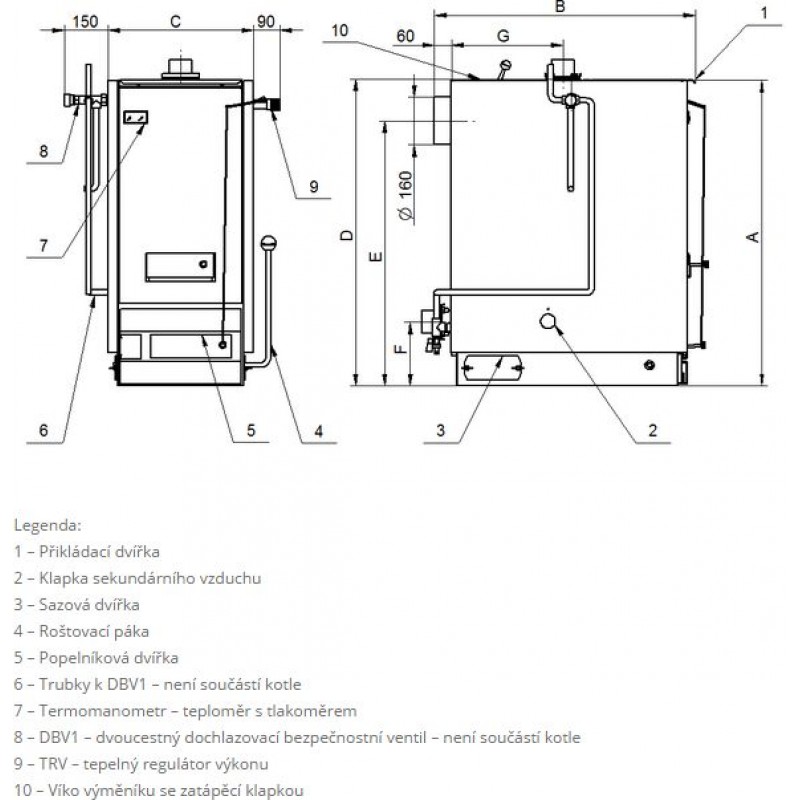 Kouřovod je v ose kotle na zadní straně. Zatápěcí klapka se ovládá z horní části kotle.