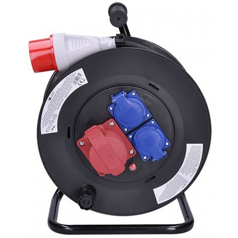 SOLIGHT PB40 prodlužovací přívod na bubnu, 3 zásuvky, 400V + 230V, 25m gumový kabel, IP44