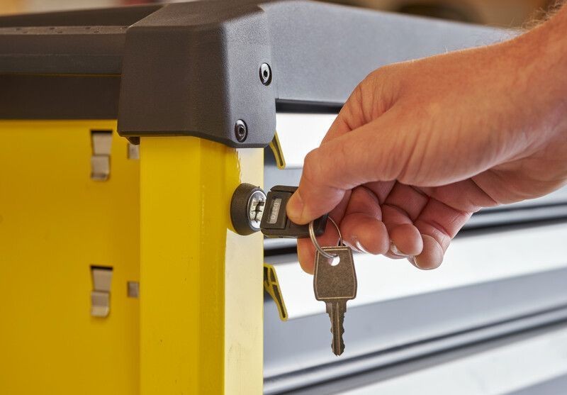 • Boční uzamykací klíč pro bezpečné uložení nářadí ve skříni, když se nepoužívá