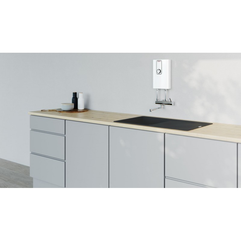 Tento elektronicky regulovaný průtokový ohřívač Stiebel Eltron je určen k montáži nad odběrné místo a snadno se začlení do různých typů interiérů. Technologie 3i přispívá k velmi dobré energetické účinnosti a zařízení umožňuje nastavení teploty s přesností na jeden stupeň v rozsahu 20 až 60 °C. Nechybí ani nastavitelné omezení teploty jako ochrana před opařením, což ocení zejména domácnosti s dětmi. Minimalistický design navíc působí čistě a nenápadně i při viditelné instalaci.