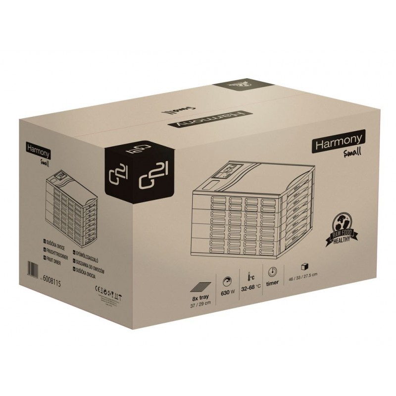 Sušička G21 Harmony small zaručuje rychlé a rovnoměrné sušení všech kousků potravin, jelikož je vybavena sušícím systémem využívajícím horizontální proudění vzduchu a termostatem pro správné nastavení teploty. Disponuje regulátorem nastavení teploty, digitálním časovačem a digitálním displejem.