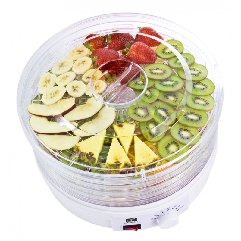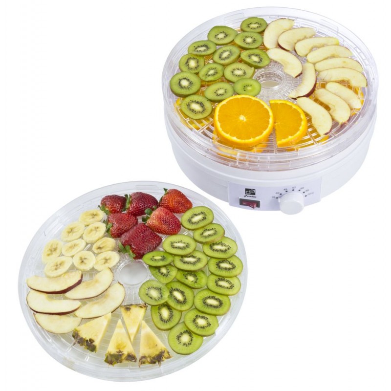V sušičce je 5 výškově nastavitelných plat o průměru 32 cm, na které můžete ovoce a zeleninu pohodlně vyskládat. Je opatřena regulátorem nastavení teploty a pojistkou proti přehřátí.